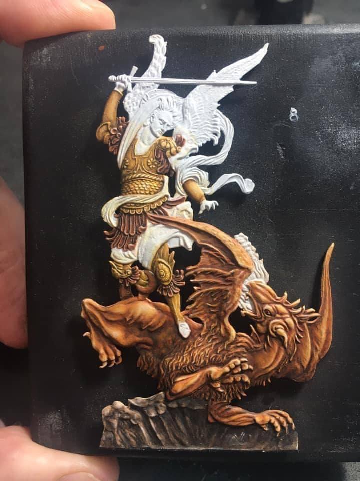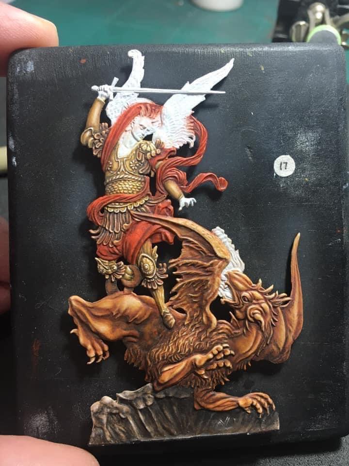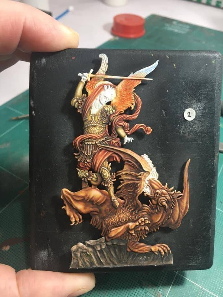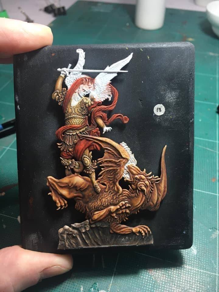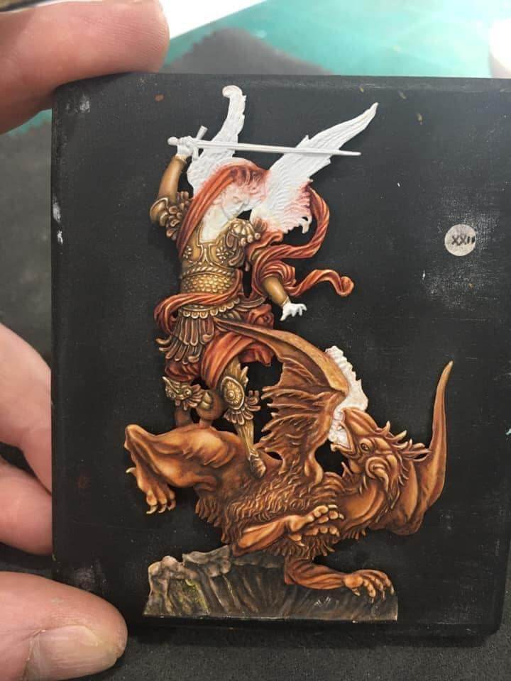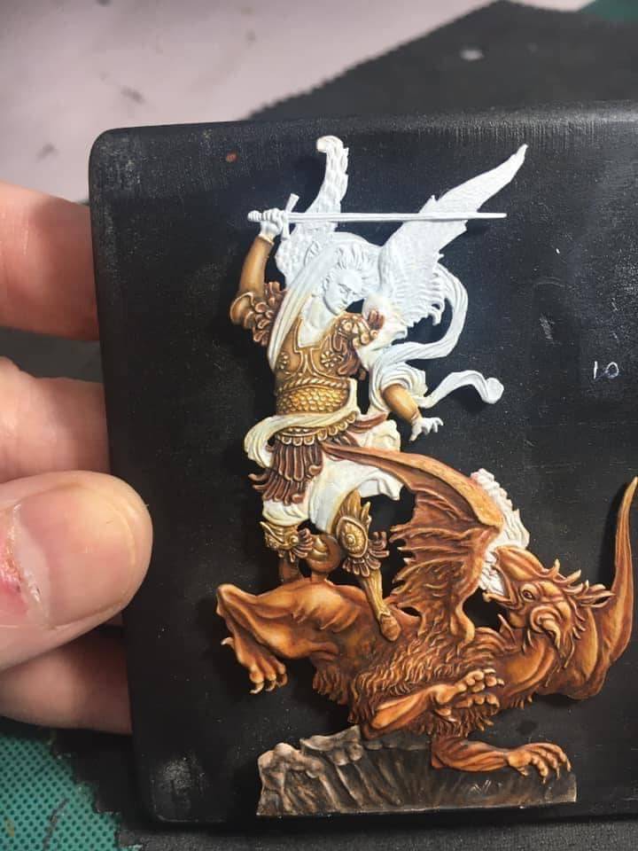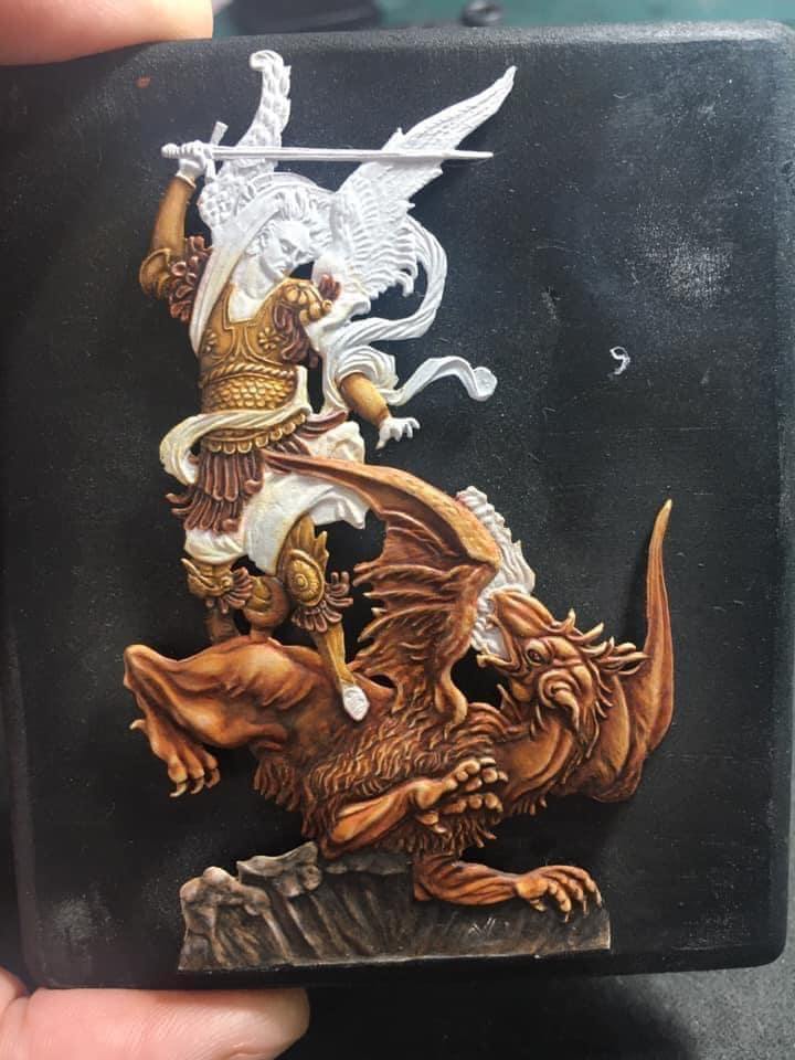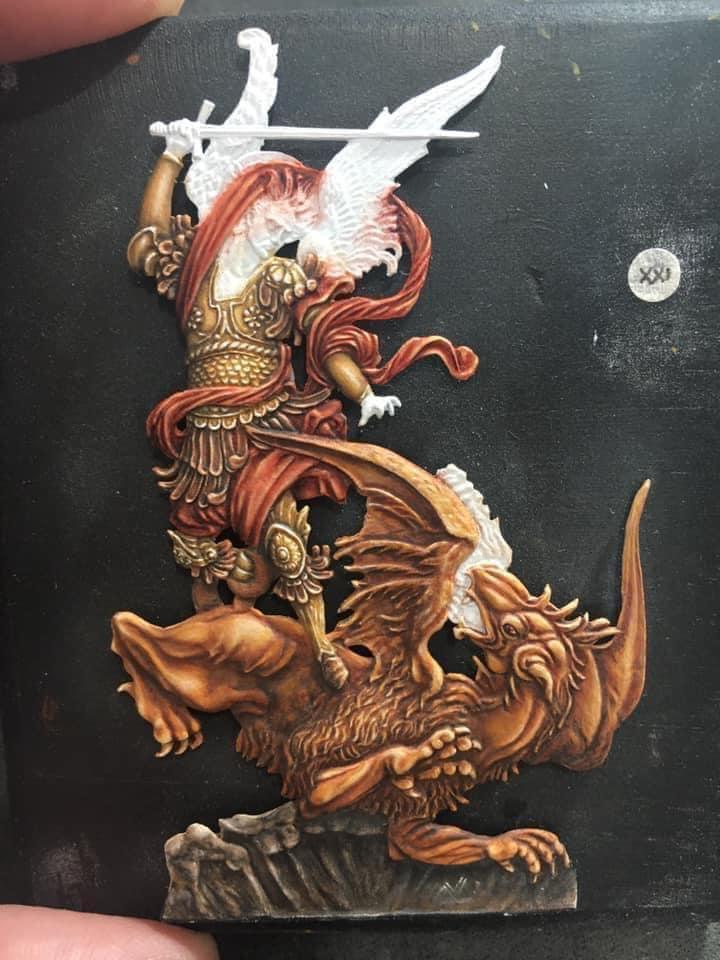 (Le processus de peinture est montré sur une figurine de 50 mm, où la technique des glacis à l’huile sur un apprêt en émail blanc a été appliquée).