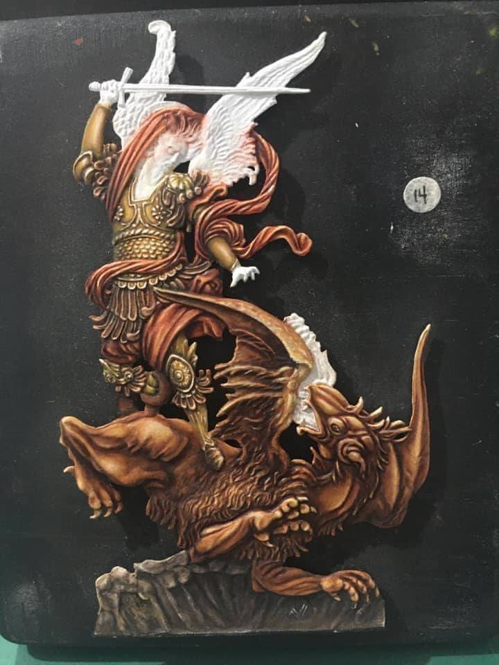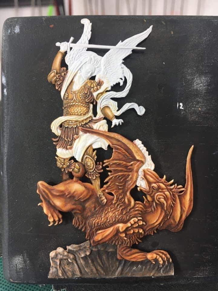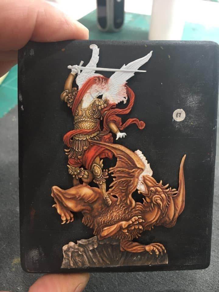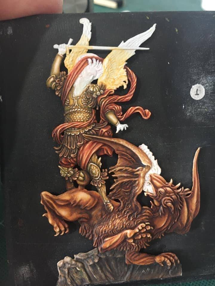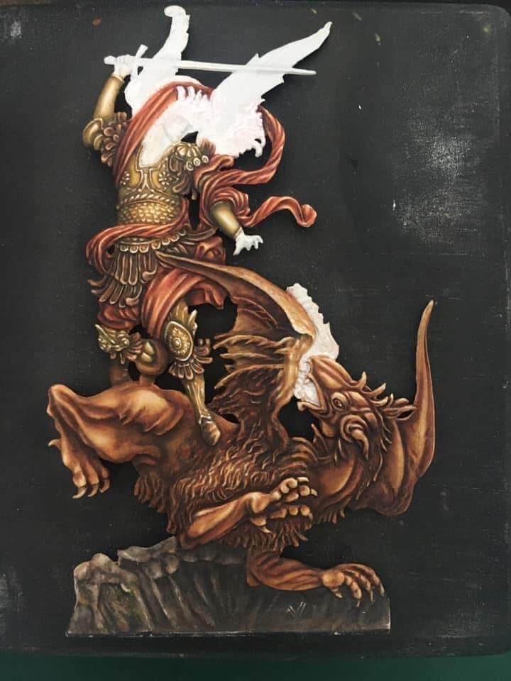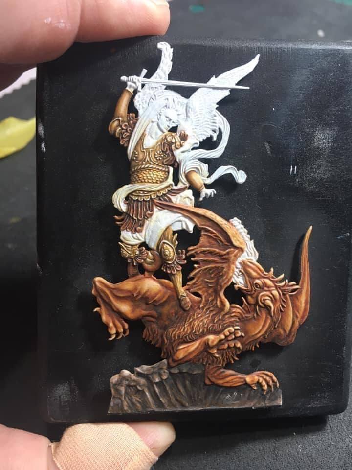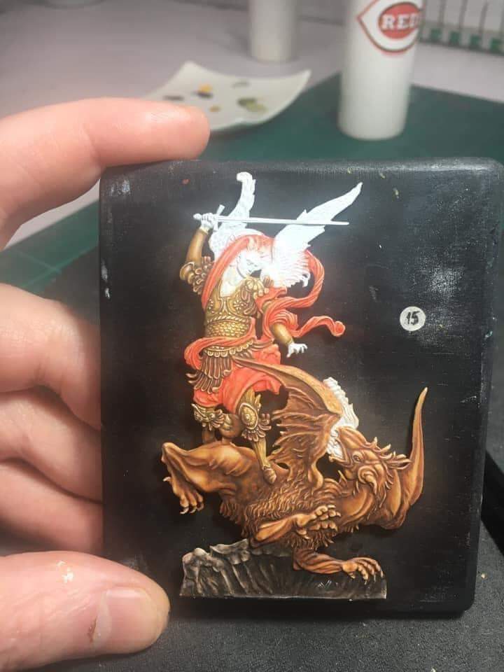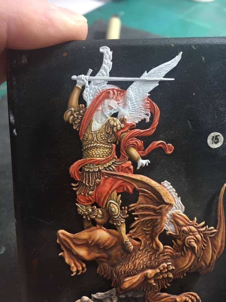 (Le processus de peinture est montré sur une figurine de 50 mm, où la technique des glacis à l’huile sur un apprêt en émail blanc a été appliquée).